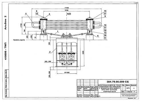 Воздухоохладитель трехсекционный шестирядный с водоотделителями 384. 79. 00. 000 поставляется в комплекте с двумя водоотделителями. Воздухоохдадитель предназначен для охлаждения и осушки сжатого воздуха поступающего из компрессорной в вентиляционную сеть пневматической очистки железнодорожных путей. Состоит из трех секций. Секции и водоотделители устанавливаются на подготовленный фундамент. Секции между собой соединяются коленами (по монтажным рискам). Производится монтаж сливных линий: от нижних штуцеров секций к отделителям с уклоном не менее 3 градусов. Для проектирования монтажных работ высылается монтажный чертеж воздухоохладителя с расположением фундаментных болтов.